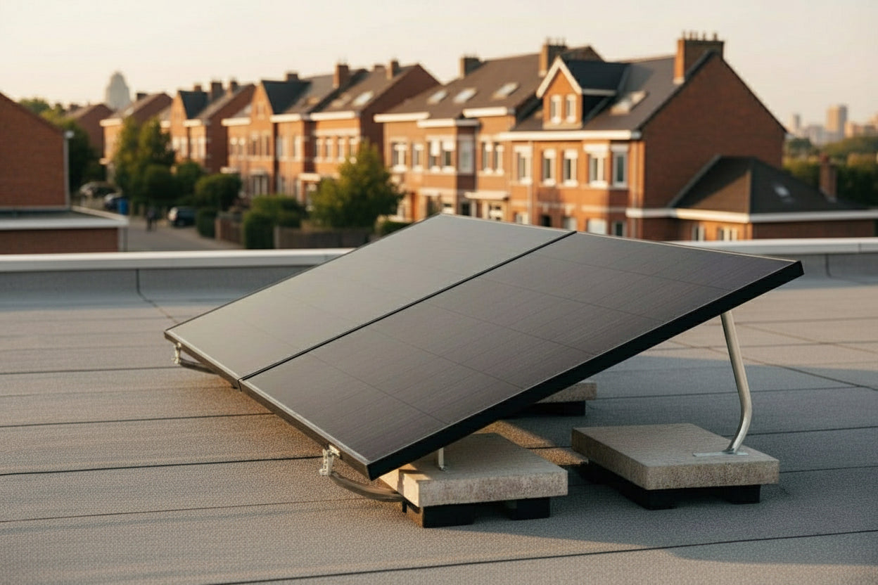 Het oppervlak moet minstens 360 x 120 cm zijn, met 20 cm ruimte langs de dakranden. Uiteraard kunnen de panelen ook op een open terras of in de tuin geplaatst worden. Wij adviseren om minstens 25 tot 30 kg ballast per paneel te voorzien, zodat alles stevig blijft staan en correct blijft functioneren, zelfs bij zwaardere windvlagen.